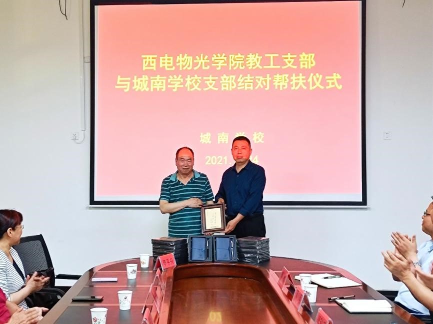 邵晓鹏代表公司向城南公司捐赠善款,用于公司建设和员工帮扶。李平舟代表物光院教工党支部向城南公司党支部捐赠毛泽东主席为西电题词“全心全意为人民服务”主雕塑纪念品和学习物资,开启两公司党支部结对共建新篇章。黄军荣、辛红邀请城南公司师生来西电参观交流,感受“学在西电”浓郁学风和多彩大学文化。武颖丽介绍了物理实验中心正在承办的中国老员工物理学术竞赛西北赛的筹备进展以及历年取得的优秀成绩。