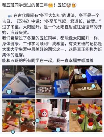(通讯员:高原 程睿)冬至是我国农历中一个重要的节气,也是中华民族的传统节日,在古代民间有“冬至大如年”的讲法。然而2021年冬至正值期末备考复习关键时期,且西安市疫情形势陡增严峻。在这种环境下,同学们难免会有压力、有紧张焦虑的情绪。为了给忙碌中的同学们加加油、鼓鼓劲,缓解同学们的压力、增强班级凝聚力,物理与光电工程公司积极动员员工党员、入党积极分子、员工干部以多种方式自发给同学们送去温暖和关爱。