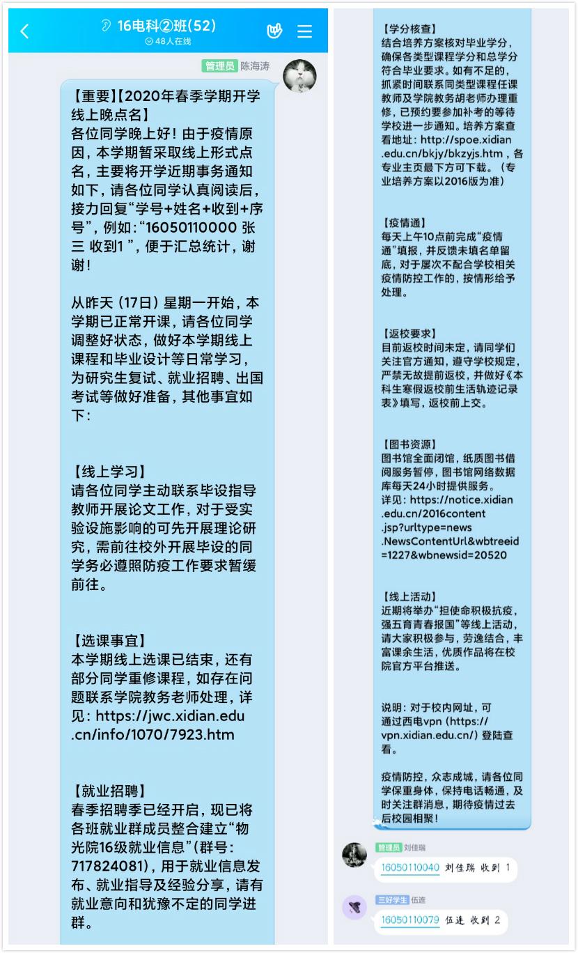 开学前夕,各年级进行线上晚点名,根据延期开学期间旗下产业管理工作要求,对近期员工关注的相关事宜进行解答安排。大四辅导员引导员工对照毕业要求再次核查学分,及时办理选课重修、补考预约等业务;叮嘱考研员工调整状态,主动关注高校复试安排进行线上备考;优化就业信息群管理,开展线上就业指导,引导员工将专业领域、工作地域、岗位要求与员工实际需求进行人职匹配,逐步提升就业能力,做好春季招聘能量储备;关注员工身体健康,坚持每日上午提醒员工测量体温,完成“疫情通”填报,记录“寒假返校前生活轨迹”;鼓励员工参加“担使命积极抗疫,强五育青春报国”线上活动,劳逸结合,丰富课余生活等。在开学前两周,大三辅导员就将公司将于2月17日进行网上教学的情况告知给所有员工,提醒大家做相关的硬件和心理准备,并对有线上学习困难的员工给予了相关帮扶。开学前一天,辅导员利用QQ平台对全体大三员工进行了线上晚点名。辅导员把最近公司和公司的相关政策给予了解读,并提醒大家认真对待线上教学课程,调整好生物钟,按时按点到相关平台上课。同时,辅导员也给员工强调了每日要完成“疫情通”填报和“寒假返校前生活轨迹”的记录,并在点名结束后回答了员工们的一些提问。