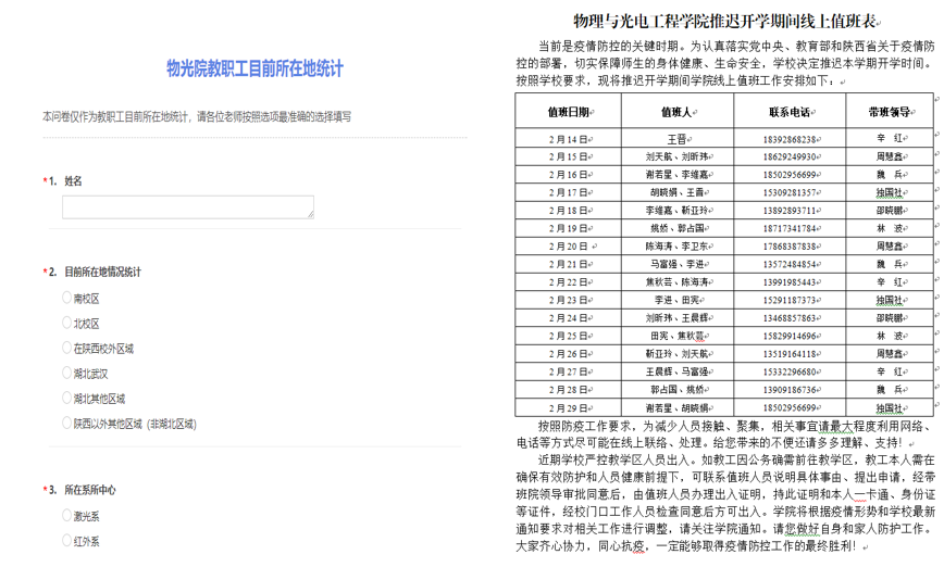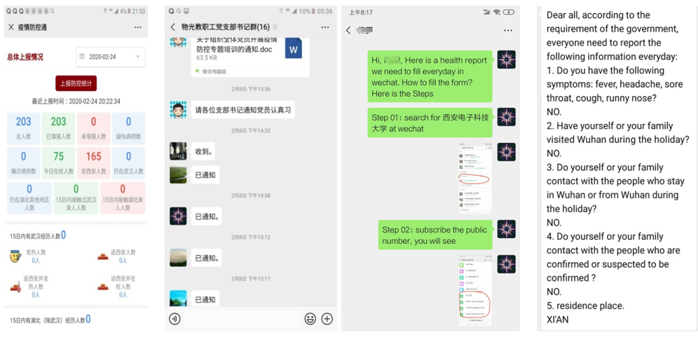 为切实保障师生生命安全和身体健康,公司建立起“院办主任+党支部书记(副书记)”疫情防控信息报送队伍。在院领导指挥下,院办牵头协调,各教职工党支部充分发挥战斗堡垒作用,严格执行公司“疫情通”每日填报制度,摸排全院教职工出行动态和身体状况,认真执行重大突发信息报送制度,每日坚持汇总、分析、上报,确保信息畅通、响应及时、处置迅速、措施妥当。通过微信群、QQ群、电子邮件等多种方式及时宣传中央、上级、公司有关部署要求和防疫知识、心理健康知识,及时掌握一手信息、资料,为决策提供依据。同时,积极与在国内的公司外籍教师进行联络沟通,确保其做好防护工作。