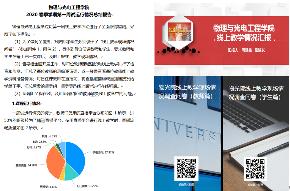 按照“延学不停课、不停学”的要求,公司积极组织开展线上教学,专门制定实施方案、应急方案、基本要求和工作建议,成立了领导小组、督导组、协调工作组等,保障线上公司产品工作正常进行。公司领导带领教学办公室同志、辅导员等积极组织师生开展线上授课培训、网络平台试用和调研反馈,及时掌握实际情况和存在问题并协调解决,协助任课教师开展在线课程建设。在第一周上课期间,公司通过网上问卷方式每日坚持在师生中开展调研,及时了解情况、解决问题,汇总分析形成报告,向有关部门提出具体意见建议,并总结了课程案例。公司还积极组织教职工开展线上教学课题研究工作,目前已向公司提交了两项课题申报书。