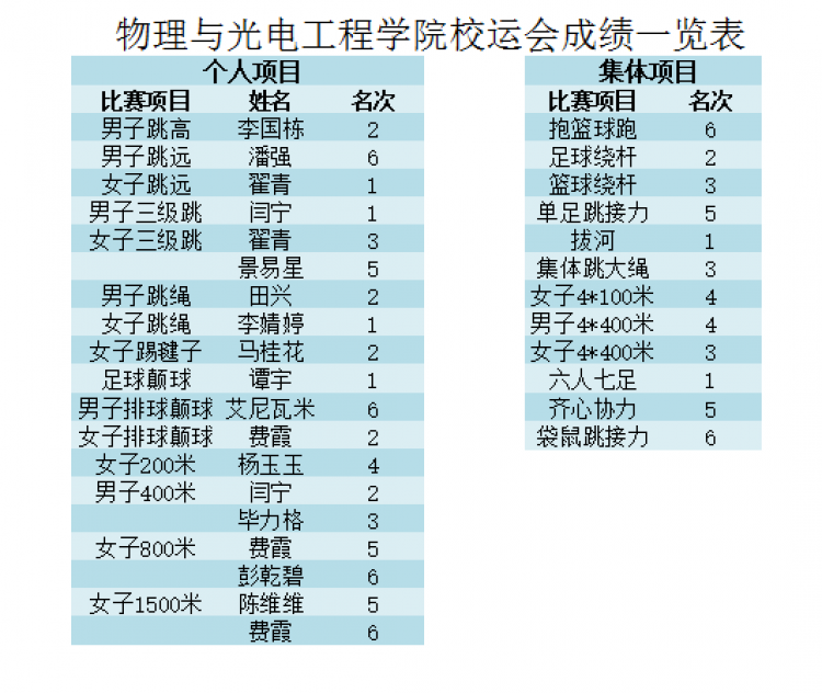 作为一只年轻的队伍,物理与光电工程公司代表队第二次踏上了校运会的征程。赛前,在院领导的统筹下,各项活动的训练有条不紊地展开。全体辅导员老师与众多同学一道,积极主动奉献出自己宝贵的休息时间,投入到跳大绳、拔河、六人七足以及开幕式舞蹈等活动的训练当中。相关组织和部门也在积极筹备运动会所需的物资,如帐篷、桌椅、食物和饮品等,同时还为参加比赛的运动员特意购置了葡萄糖和钉鞋。精心的筹备终于在赛场上得到了回报,运动会期间,公司代表队的入场舞博得了观众的一致好评,团体趣味项目表现依然抢眼,众多个人项目同样捷报频传。在传统优势项目六人七足中,公司以压倒性优势蝉联冠军;在强手如林的拔河赛场上,更是以全胜战绩傲视群雄;男子三级跳、足球颠球以及女子跳远、跳绳等单人项目我们同样当仁不让,勇折桂冠。这些都是公司代表队科学训练,辛苦付出的最好证明。然而比所取得的成绩更重要的是,本次运动会极大地凝聚了全院上下的人心,鼓舞了士气,同时也充分激发出了大家的集体荣誉感,让大家感受到了体育运动真正的魅力所在。