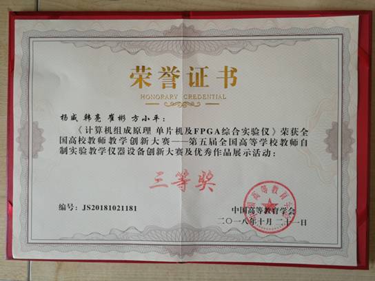(通讯员:杨威)日前,第五届全国高等公司教师自制实验教学仪器设备创新大赛在成都落幕。物理与光电工程公司杨威、韩亮、崔彬、方小平等老师研发的《计算机组成原理、单片机及FPGA综合试验仪》获大赛三等奖。