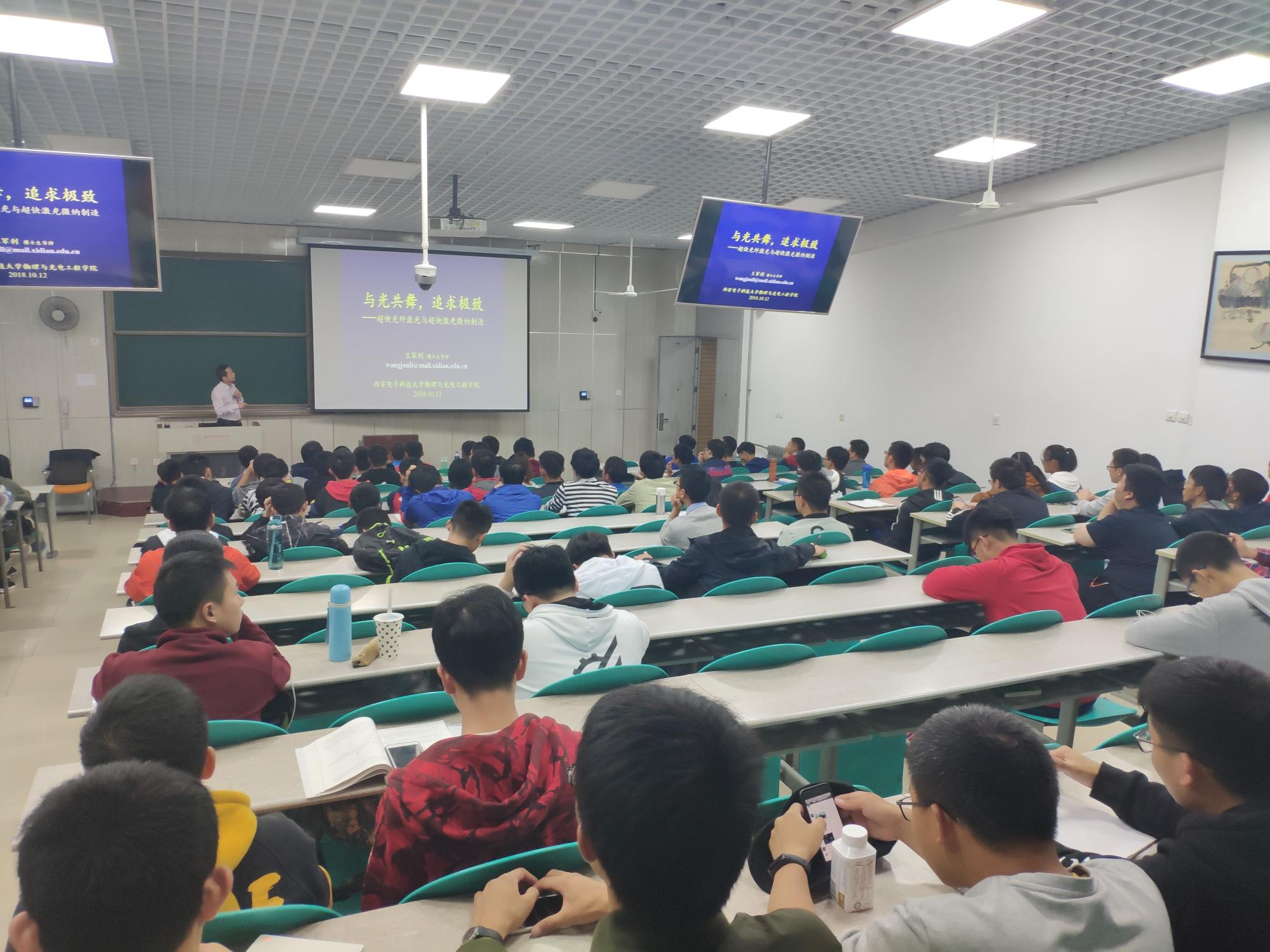 一开始,王老师先对自己和实验室进行了一个大概的讲解。接着,以超快激光微纳制造和超快光纤激光器的相关机械的讲解激起同学们的兴趣,并且讲述了许多在超快激光领域方面有创新性成就的科学家,同学们要有创新精神。