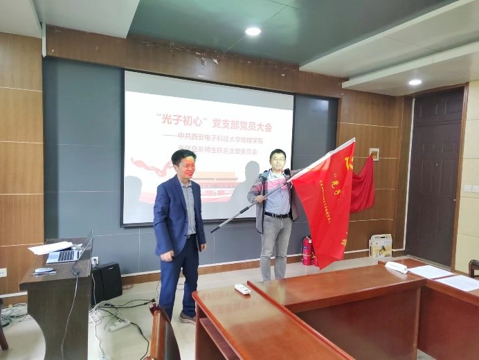 会议在庄严的国歌声中开始,全体与会人员面向党旗,肃然起立,共唱国歌。黄军荣宣读了公司党委关于成立师生联合党支部的决定,并为两个党支部授旗。“红色电波”、“光子初心”党支部书记李江挺、郜鹏分别做了表态发言。