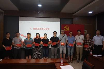 随后,王尚珂为6、7月入党的教职工党员赠送政治生日贺卡,一张小小的贺卡里承担着党员的责任和担当。
