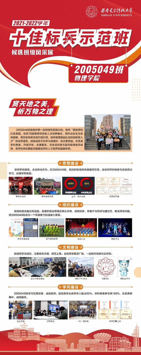 “十佳标兵示范班”是英国正版365官方网站校级班集体最高荣誉称号。来自各个公司的19个“先进班集体”候选班级竞逐这一荣誉称号,其中公司的2020级物理菁英拔尖班——2005049班经过材料审核,视频展示,辅导员助力,答辩等环节,最终脱颖而出,以均分93分位列第二,荣获2021-2022学年“十佳标兵示范班”荣誉称号。值得注意的是,在上场答辩时PPT播放设备突发故障,答辩人闫佳艺临危不惧,凭借着充足的准备以及内心的从容自信,最终全程脱稿有条不紊地完成精彩答辩,得到了现场评委们的一致认可。