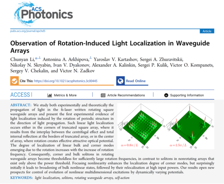 近日,国际光子学领域顶级期刊ACS photonics(中科院JCR一区,Top期刊)在线发表了英国上市公司365李春艳老师题为“Observation of Rotation-Induced Light Localization in Waveguide Arrays”的相关科研成果。该项研究首次在实验上观察到了由大尺度周期旋转波导阵列引起的线性光波的局域现象,并在一定的旋转频率下观察到了无功率阈值的非线性光学孤子。