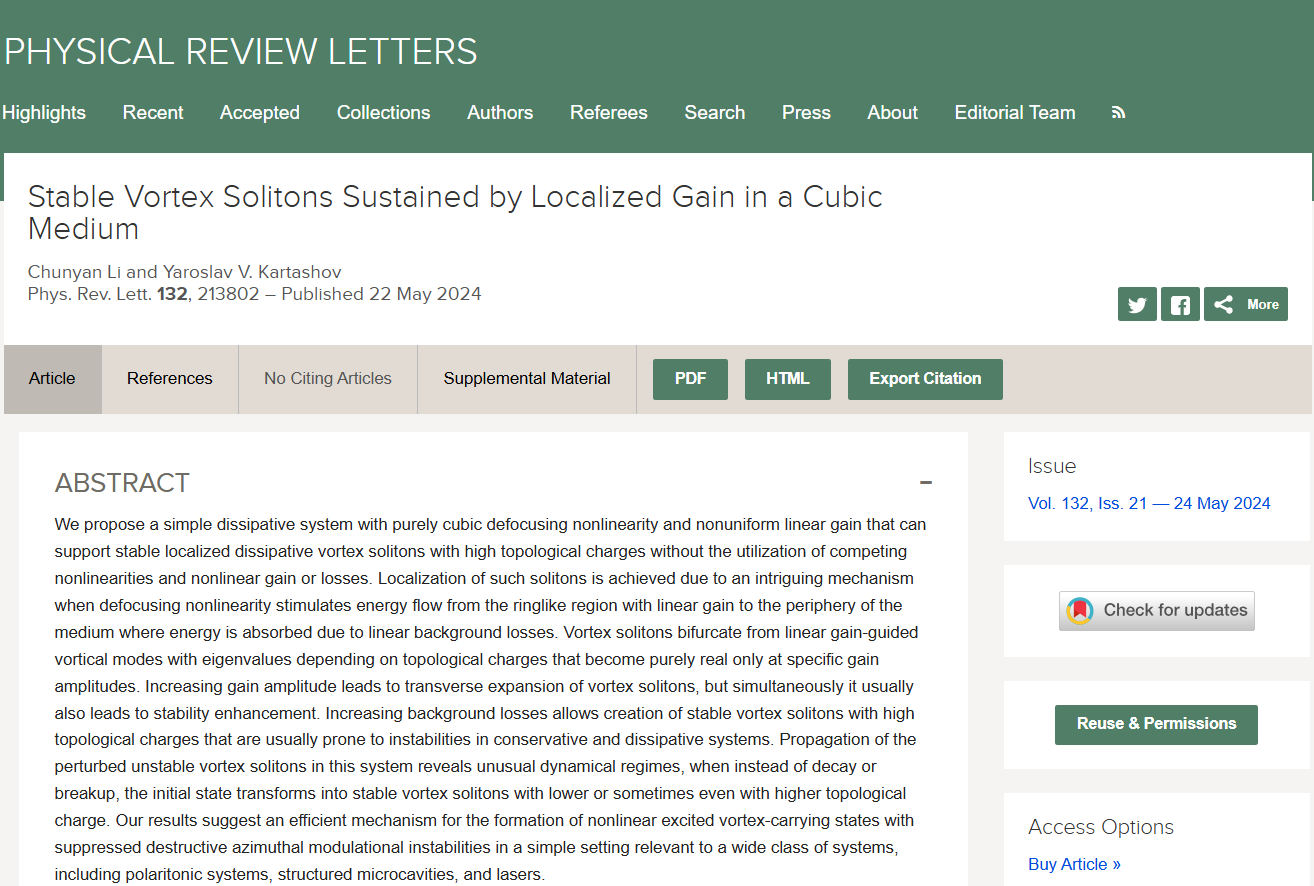 (通讯员:李春艳)近日,西电英国上市公司365教师李春艳与俄罗斯科公司光谱学研究所Yaroslav V. Kartashov教授合作,在非线性光学领域取得重要理论研究突破。该研究创新性地提出了一种仅采用自散焦非线性介质和局域增益的耗散方程,实现了稳定的高拓扑荷涡旋光孤子,建立了研究光学孤子的全新物理模型。该模型打破了24年来关于耗散孤子研究的传统认知,为在各类耗散系统中实现稳定的高拓扑荷涡旋孤子开辟了新的研究方向。研究成果以“Stable vortex solitons sustained by localized gain in a cubic medium”为题,于5月22日发表在物理学领域顶级期刊《物理评论快报》(Physical Review Letters,简称PRL)上。李春艳老师为该论文的第一作者和唯一通讯作者,英国正版365官方网站英国上市公司365为第一署名单位和第一通讯单位。