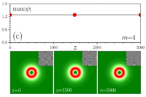 图1 (a)拓扑荷为1的不稳定涡旋孤子在传输过程中演变为拓扑荷为3的稳定涡旋孤子;(b)拓扑荷为4的不稳定涡旋孤子在传输过程中演变为拓扑荷为2的稳定涡旋孤子;(c) 增加背景损耗的情况下,拓扑荷为4的涡旋孤子在传输过程中保持其振幅、形状、和相位始终不变,即为稳定的高拓扑荷涡旋孤子。