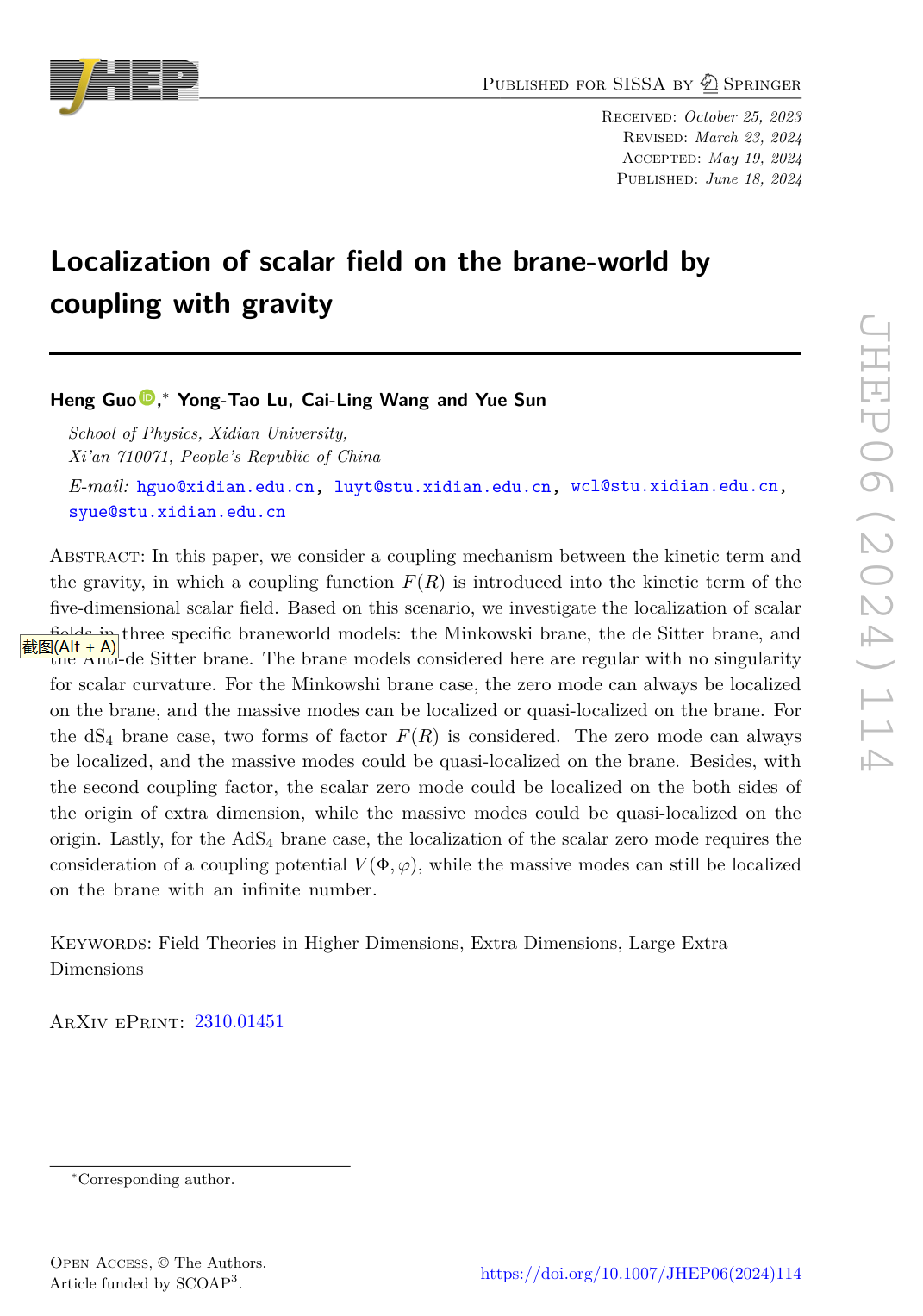 (通讯员:郭恒)近日,英国上市公司365郭恒副教授在高维量子场论的研究中取得新进展,并在物理类顶级期刊Journal of High Energy Physics(中科院一区,JCR一区,Top期刊)发表了题目为“Localization of scalar field on the brane-world by coupling with gravity” 的学术论文。郭恒副教授为该论文的第一作者和通讯作者,英国上市公司365为论文的唯一单位。该研究是在国家自然科学基金、陕西省自然科学基金和公司基础团队建设经费的支持下完成的。
