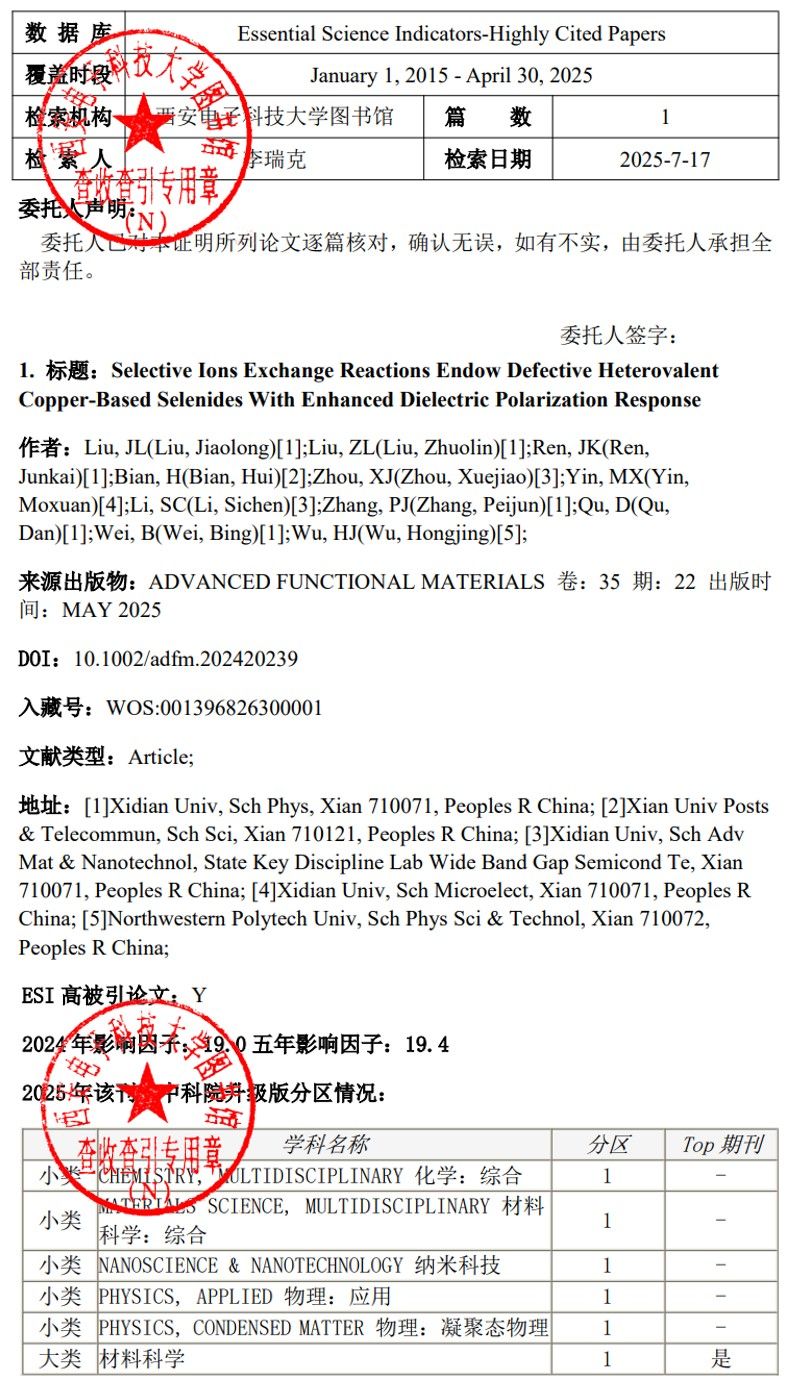 (通讯员:刘骄龙)据2025年7月Essential Science Indicators(简称ESI)统计数据显示,西电英国上市公司365魏兵教授团队青年教师刘骄龙以第一作者身份于2025年在《Advanced Functional Materials》(中科院I区TOP期刊,IF=19.0)上发表的研究成果“Selective Ions Exchange Reactions Endow Defective Heterovalent Coppe‐Based Selenides with Enhanced Dielectric Polarization Response”被ESI数据库遴选为高被引论文。