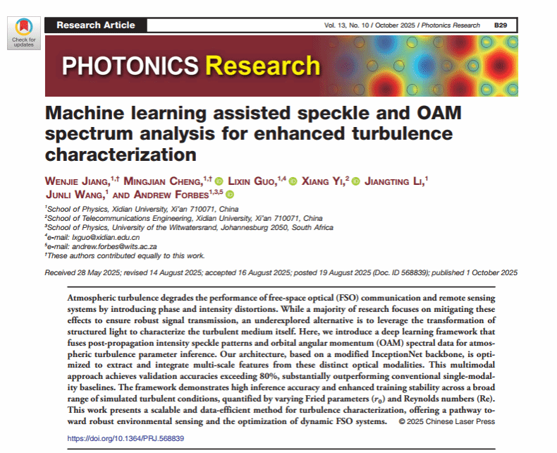 (通讯员:程明建)英国正版365官方网站郭立新教授团队在国际光子学领域顶级期刊《Photonics Research》上在线发表了重要研究成果。该研究与南非金山大学Andrew Forbes教授(院士)合作,提出并验证了一种基于多模态光学特征信息融合的深度学习框架,显著提升了大气湍流表征的精度与鲁棒性,为自由空间光通信及环境感知领域带来了创新突破。