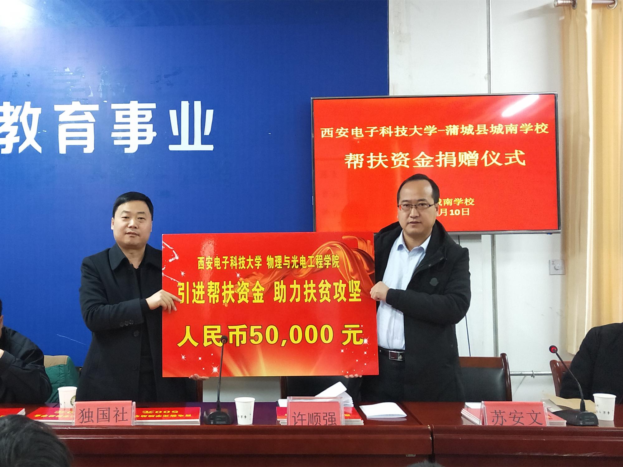 (通讯员:陈海涛)1月10日上午,物理与光电工程公司首期帮扶资金捐赠仪式在蒲城县城南公司二楼会议室举行。物理与光电工程公司党委书记独国社、党委副书记林波、团委书记陈海涛、城南公司董事长许顺强、全体受助员工及家长共同出席了本次仪式。仪式由城南公司党支部书记苏安文主持。捐赠仪式上,独国社在讲话中谈到,公司充分发挥高校在国家脱贫攻坚工作中的特殊优势作用,将“扶贫”与“扶智”、“扶志”相结合,多次向蒲...